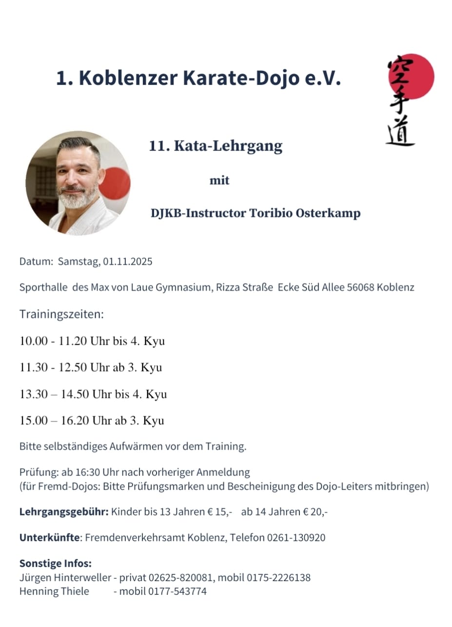 Am letzten Wochenende im November findet das Niederländische Gasshuku 2025 statt. Die Karateka aus unserem Nachbarland haben sich nicht lumpen lassen und werden 6(!) Senseis aus Japan einfliegen lassen. Man kann das ganze Wochenende dort von den japanischen Meistern lernen (Andrea und ich haben bereits gebucht , aber auch einzelne Tage mit trainieren. Die Anreise aus Bonn beträgt mit dem Auto ca. 1,25h; sollte Interesse bestehen lasst es Andy oder mich wissen. Wir stehen auch im Kontakt mit unseren Freunden vom Dojo Funakoshi und ggf. können Fahrgemeinschaften gebildet werden.