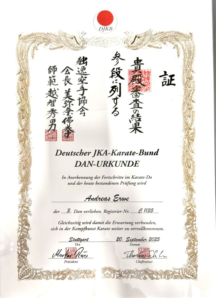 - 2025 Prüfung zu 3.DAN in Stuttgart mit Erfolg teilgenommen.